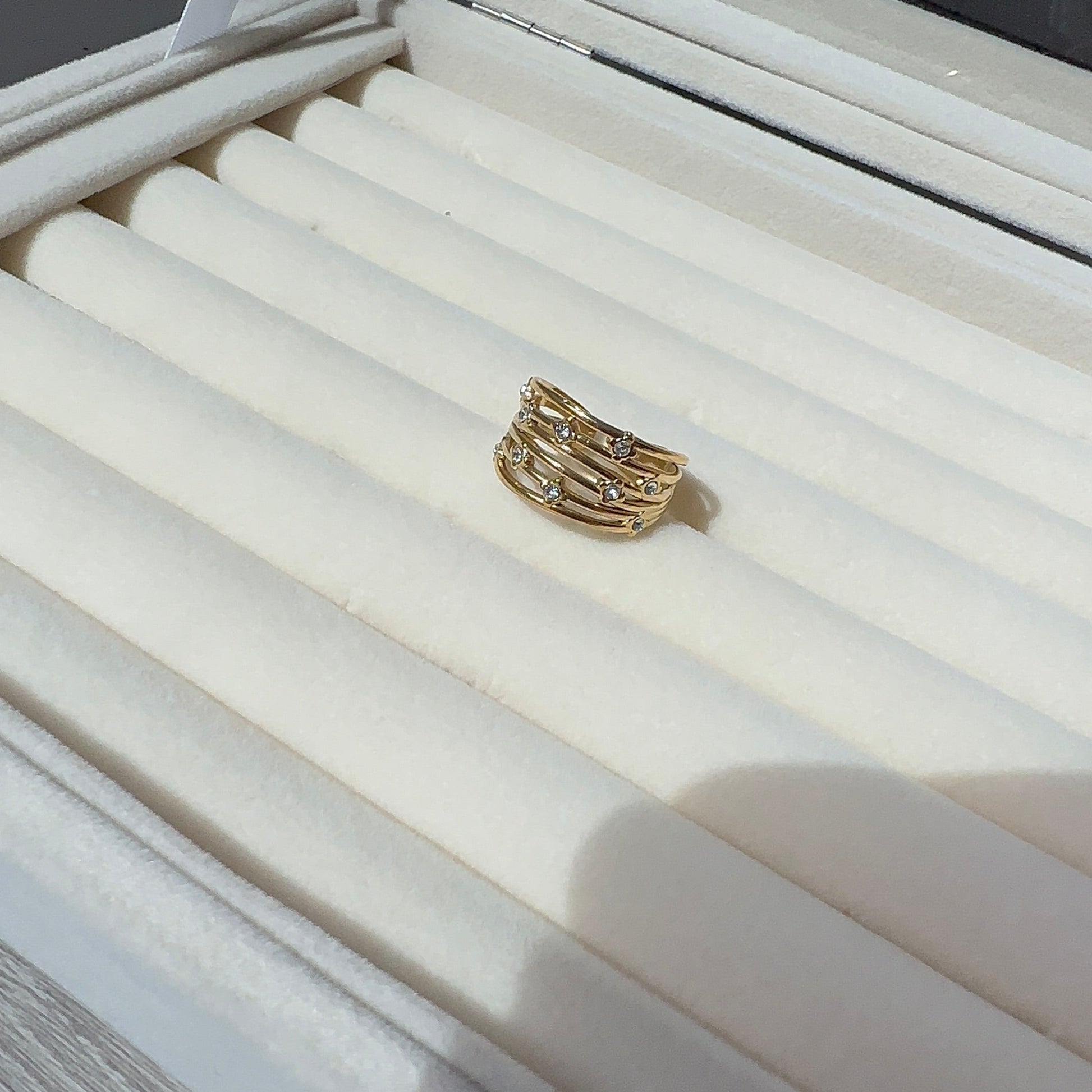 Make a bold statement with this stunning multi-band 18k gold plated ring featuring sparkling crystal accents across multiple gold-tone bands. This eye-catching piece combines modern design with classic elegance, creating a sophisticated layered look in one beautiful ring.